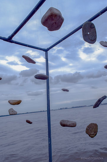 It was crucial for the setting to seem natural to the rocks, to create a feeling of disturbed gravity. 20 rocks are cut in the middle using a drill and hung from the PVC pipes with a fishing line. The PVC pipes were cut using a saw and connected through small tubes.