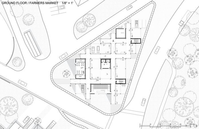 Trumansburg Village consists of 1,600 population, mostly inhabiting women over 50 with an increasing population decline. The site is positioned on a current farmers market which runs through the summer, leaving the site without use during winter. Environmental impacts on the site consist of strong winds coming from the West, with a slight wind from the East and NE. The sun is strongest on the Southern side which is positioned higher in the summer and lower in winter.